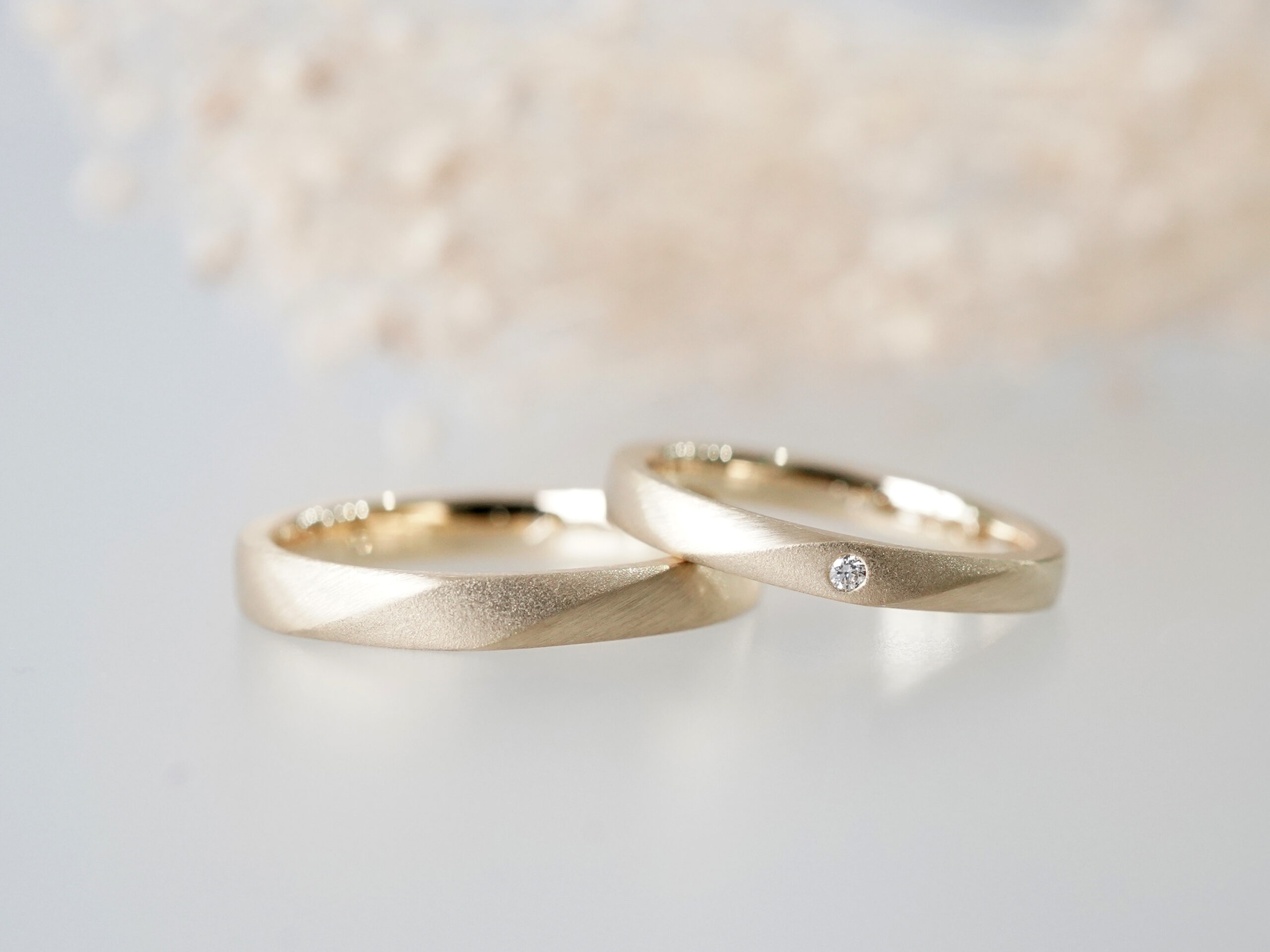 イエローゴールドの輝きをそっと包みこむ、やわらかな印象のご結婚指輪をご制作いただきました。