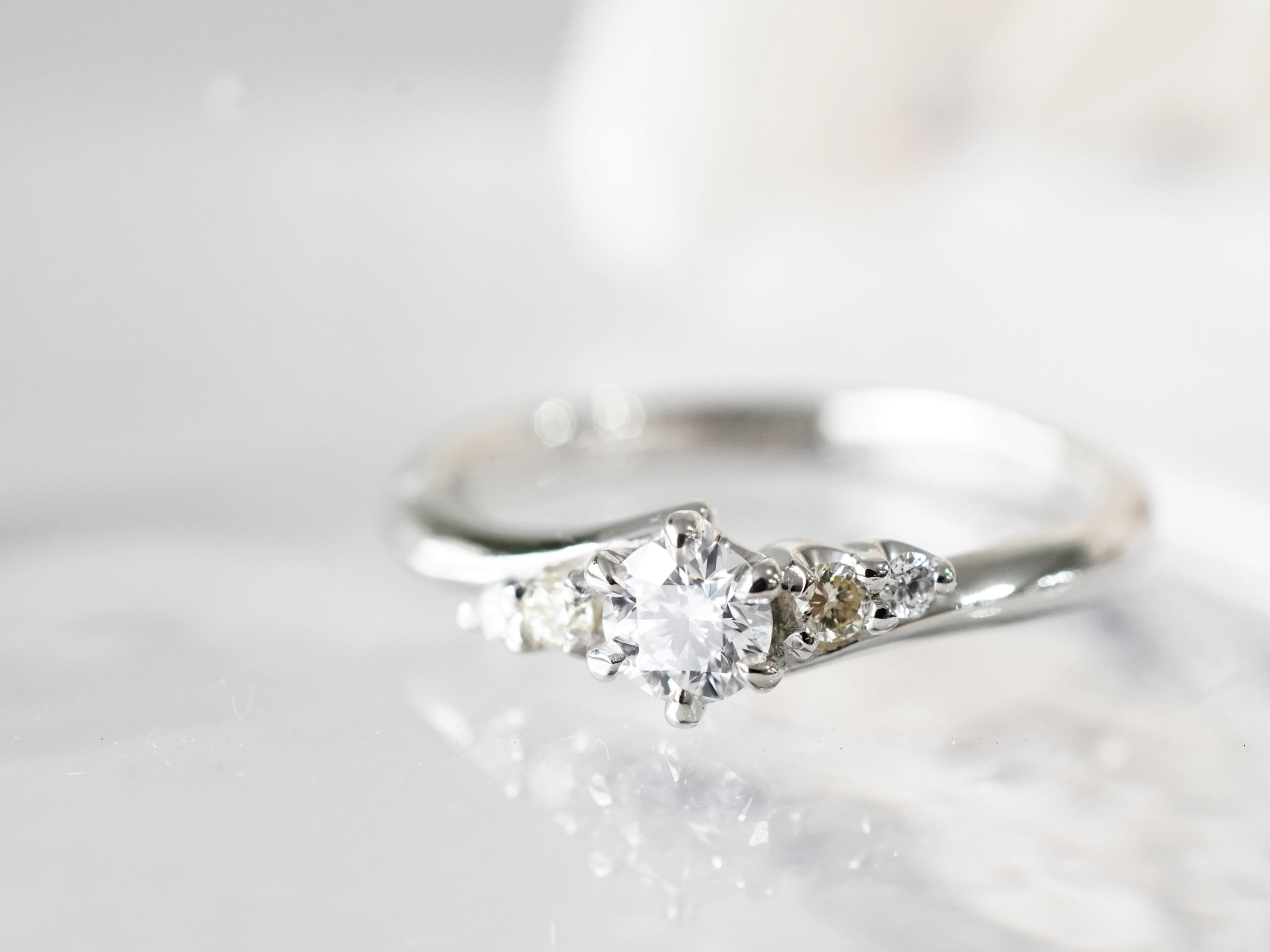 中央に向かって優しく流れるラインに、5石のダイヤモンドが煌めくご婚約指輪。
