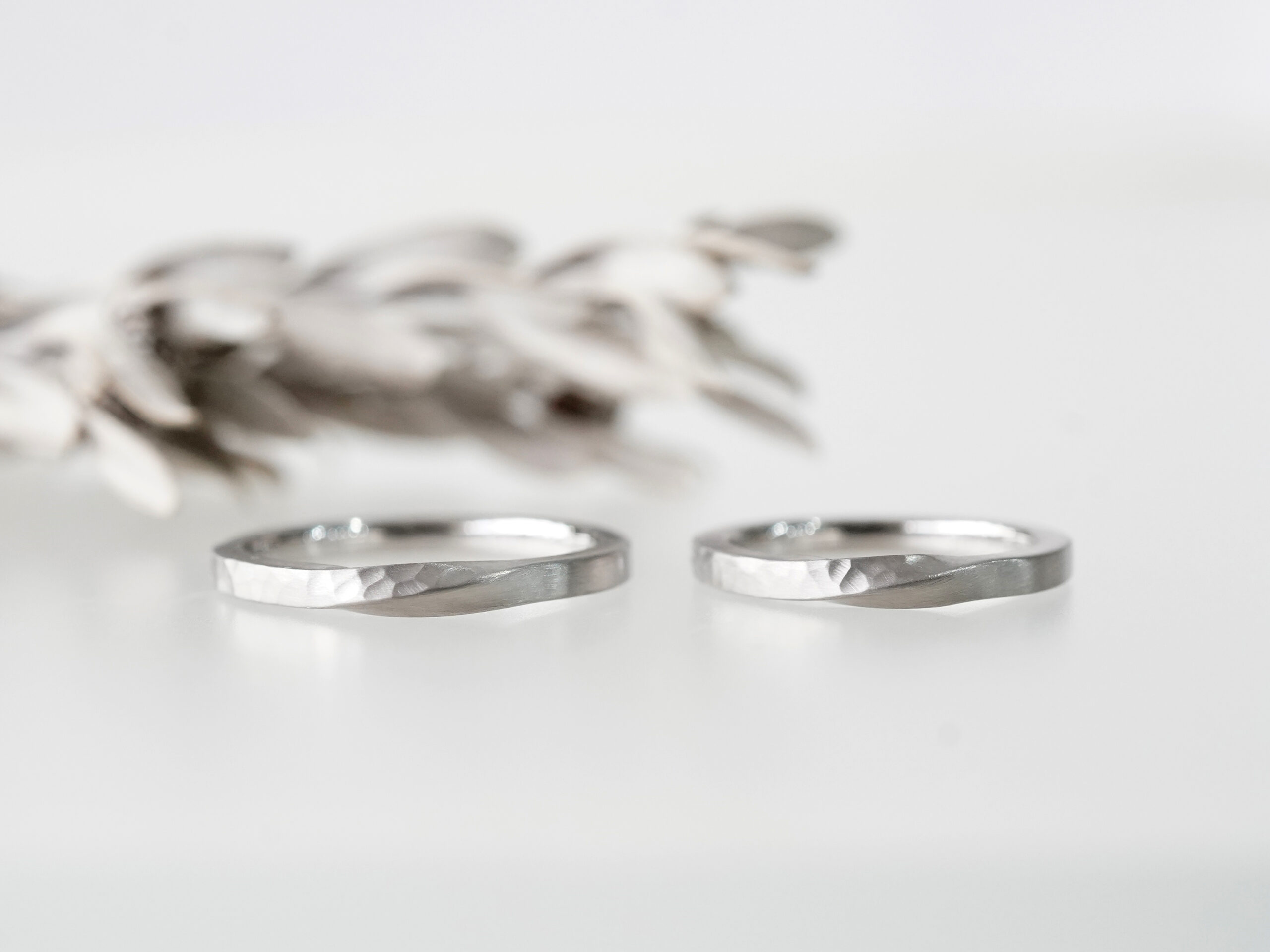手作業による“ひねり”と“槌目”が作り出す温もり、そしてグレーゴールドの落ち着いた色合い。これからのおふたりの毎日にそっと寄り添い、時を重ねるほど味わいが深まっていく、そんな想いを込めたご結婚指輪が完成いたしました。