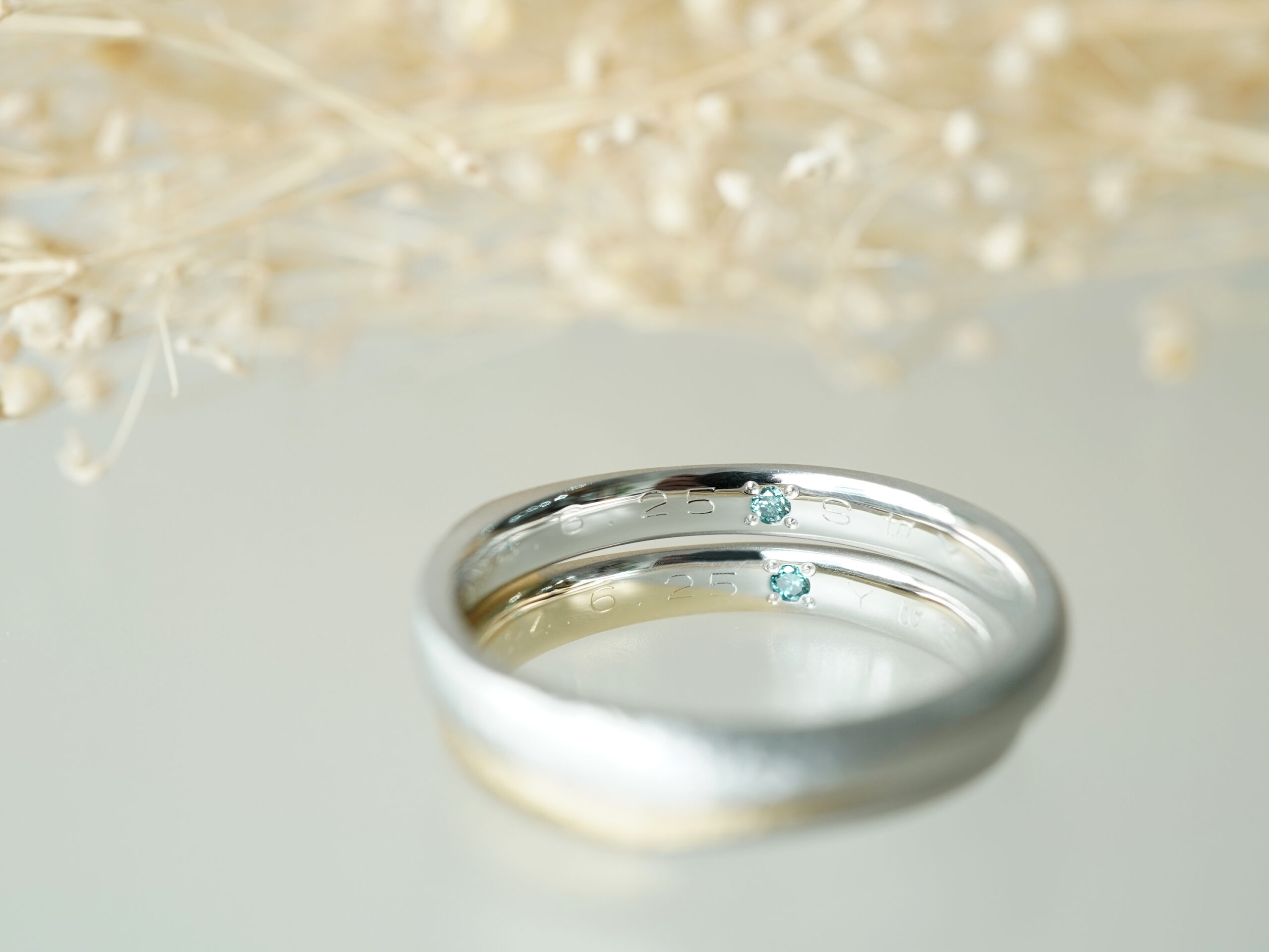 内側には刻印と、"誠実・永遠"を象徴するブルーダイヤモンドを忍ばせ、これからの歩みが揺るぎないものであるよう、おふたりの大切な願いが込められています。