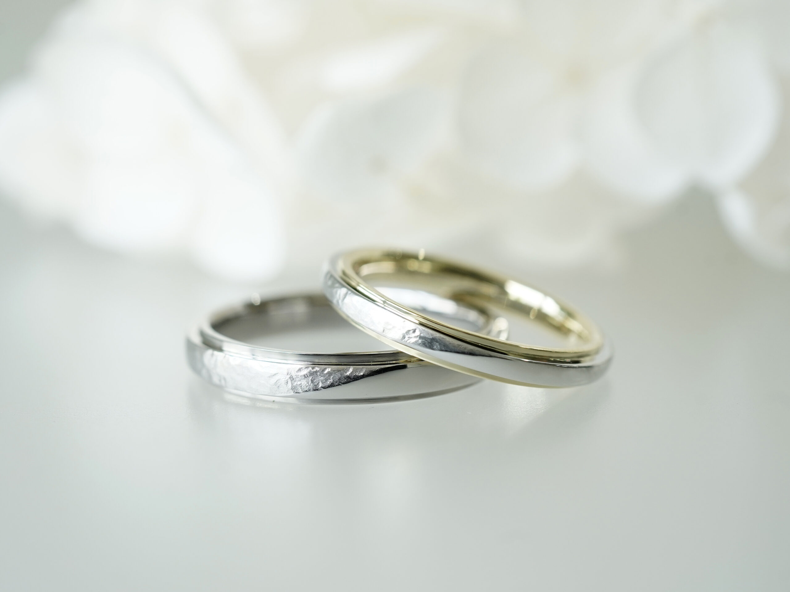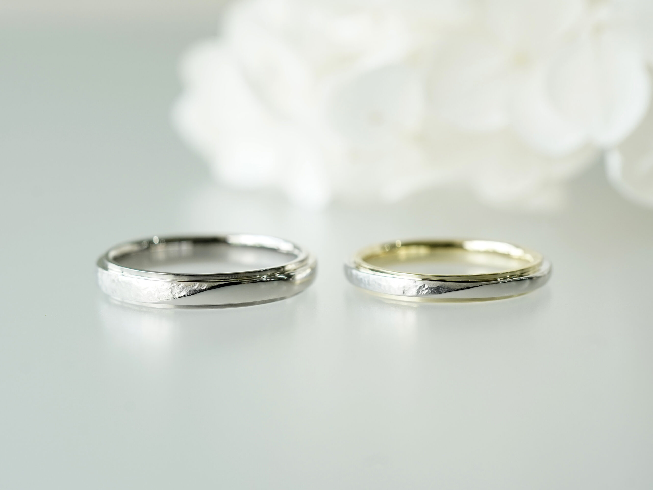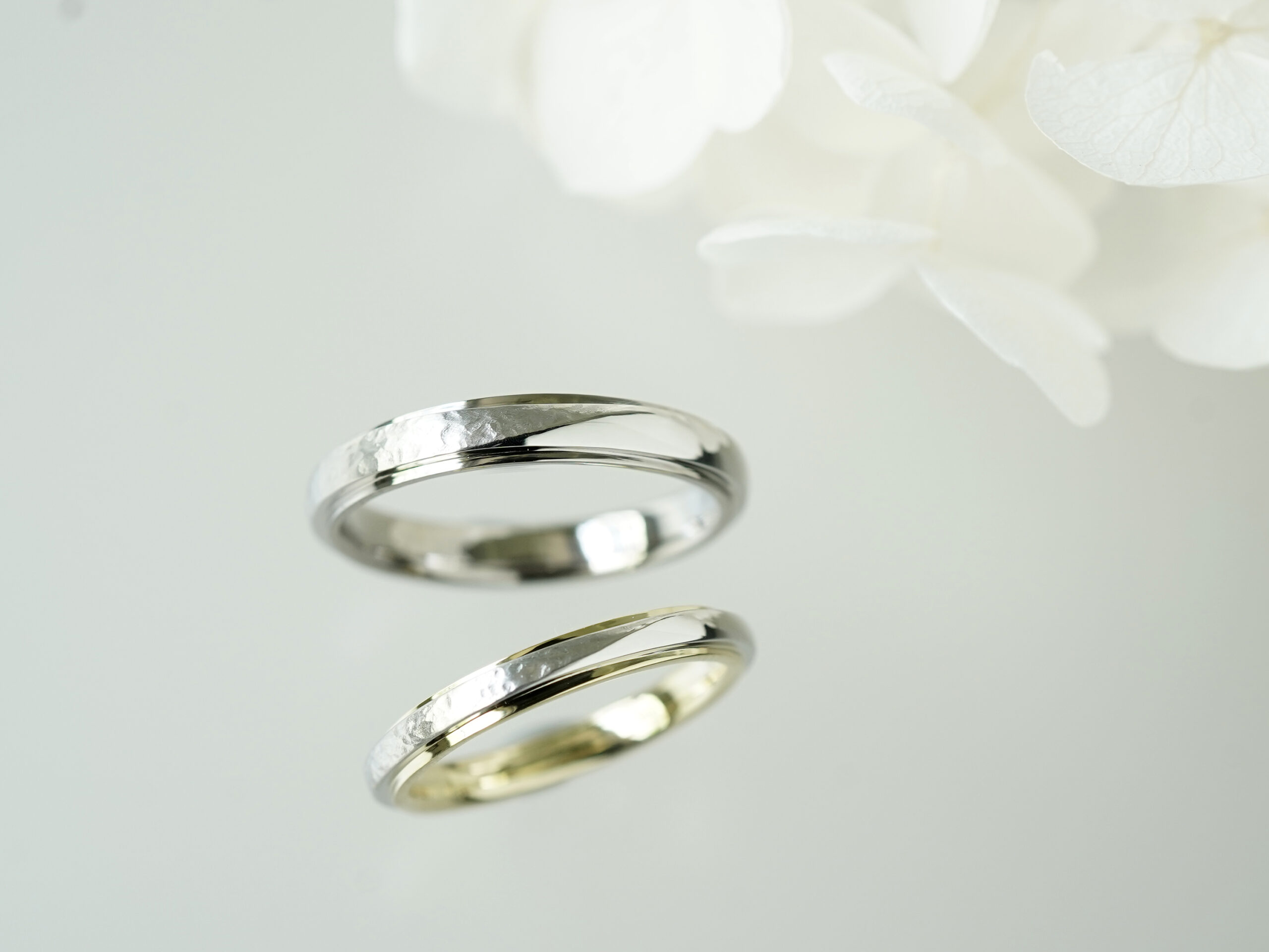 そしてプラチナ部分の半周にはハンマー模様を施し自然な輝きと立体感をプラス。