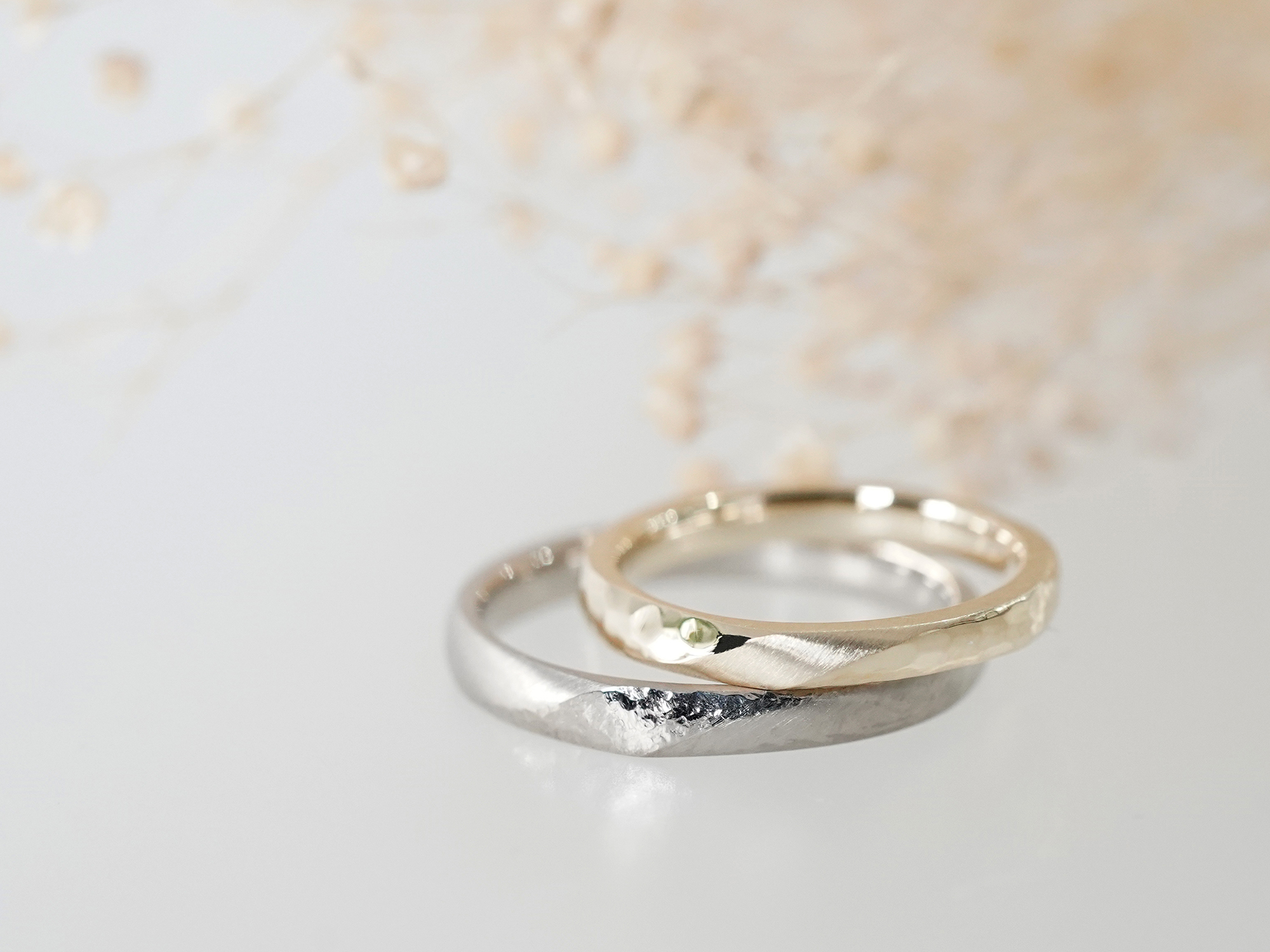ホワイトゴールドとイエローゴールド、それぞれの個性をいかしてデザインしたご結婚指輪を手作りコースにてご制作いただきました。
