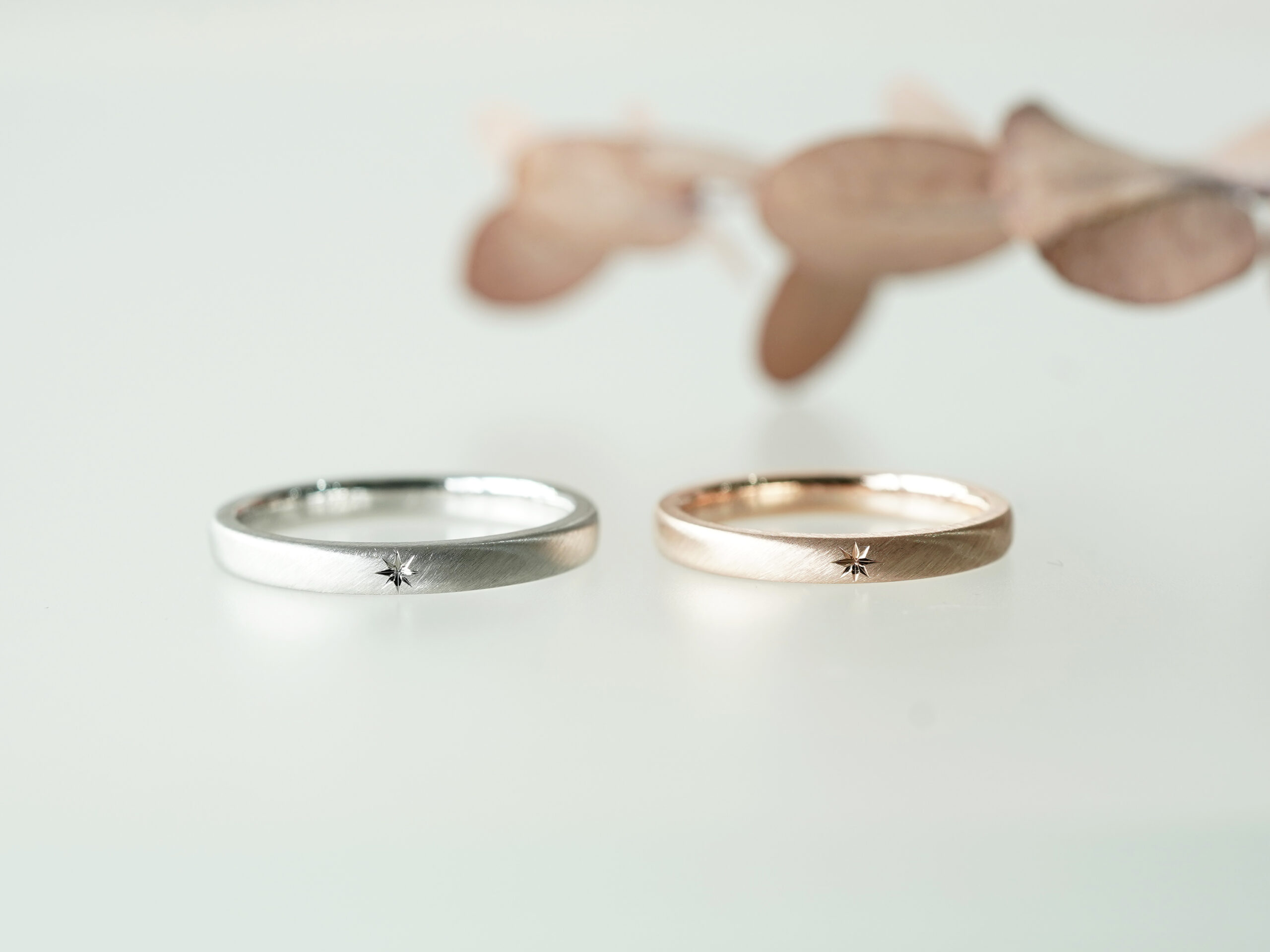 中央にそっと星の彫り模様が施されたご結婚指輪を手作りコースにてご制作いただきました。
