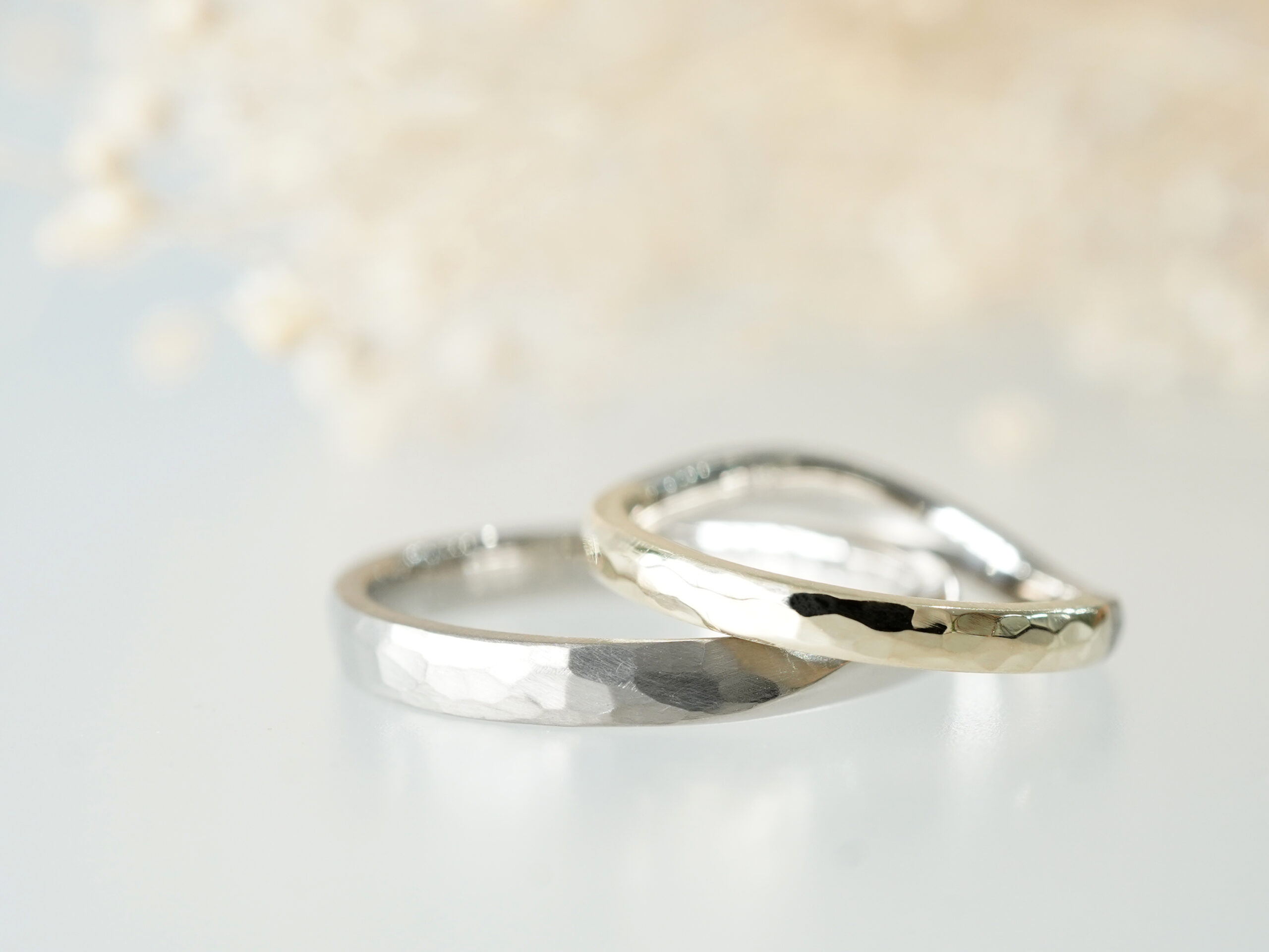 お揃いの鎚目模様を打ち付けた、あたたかみのあるご結婚指輪。