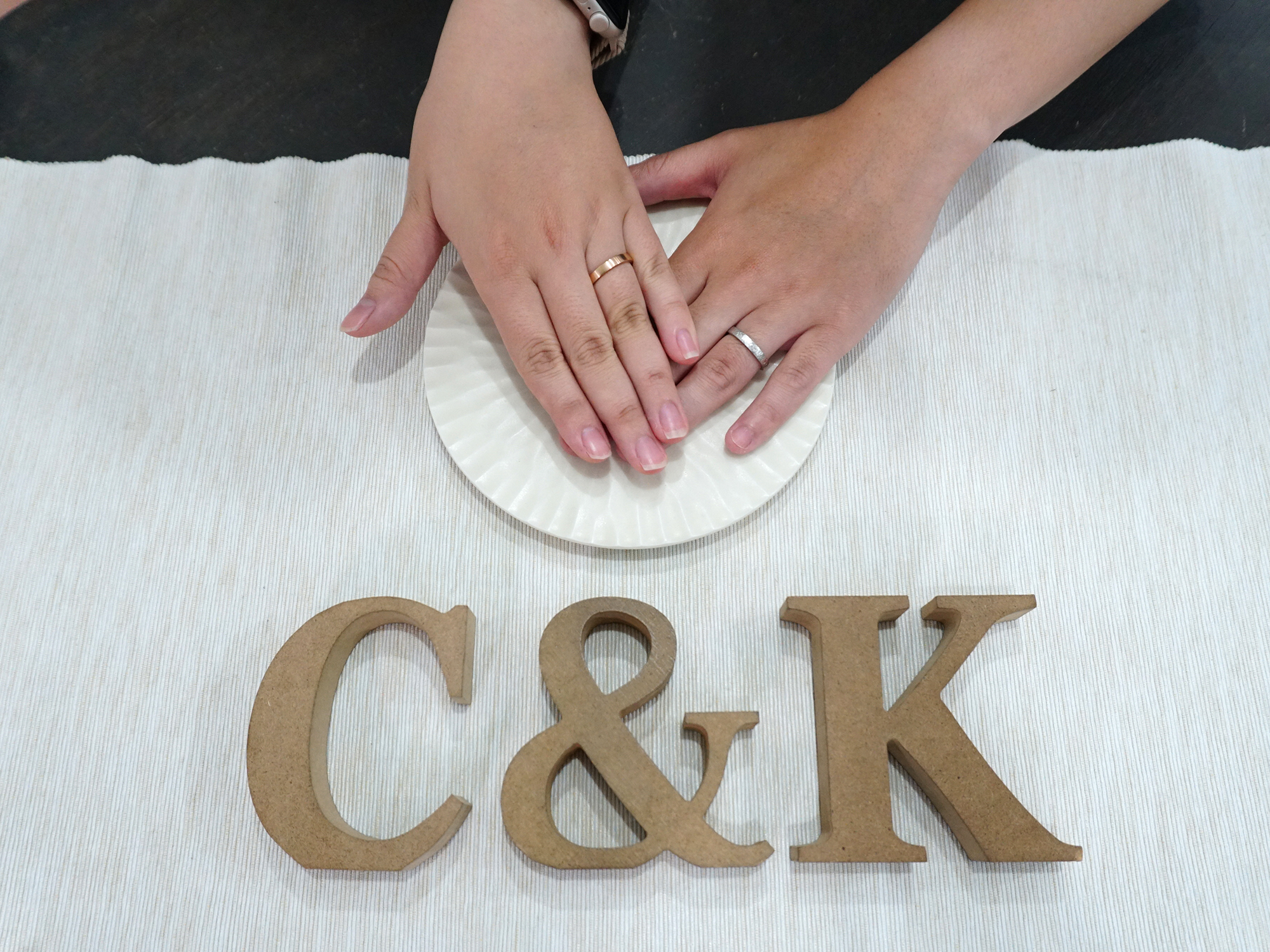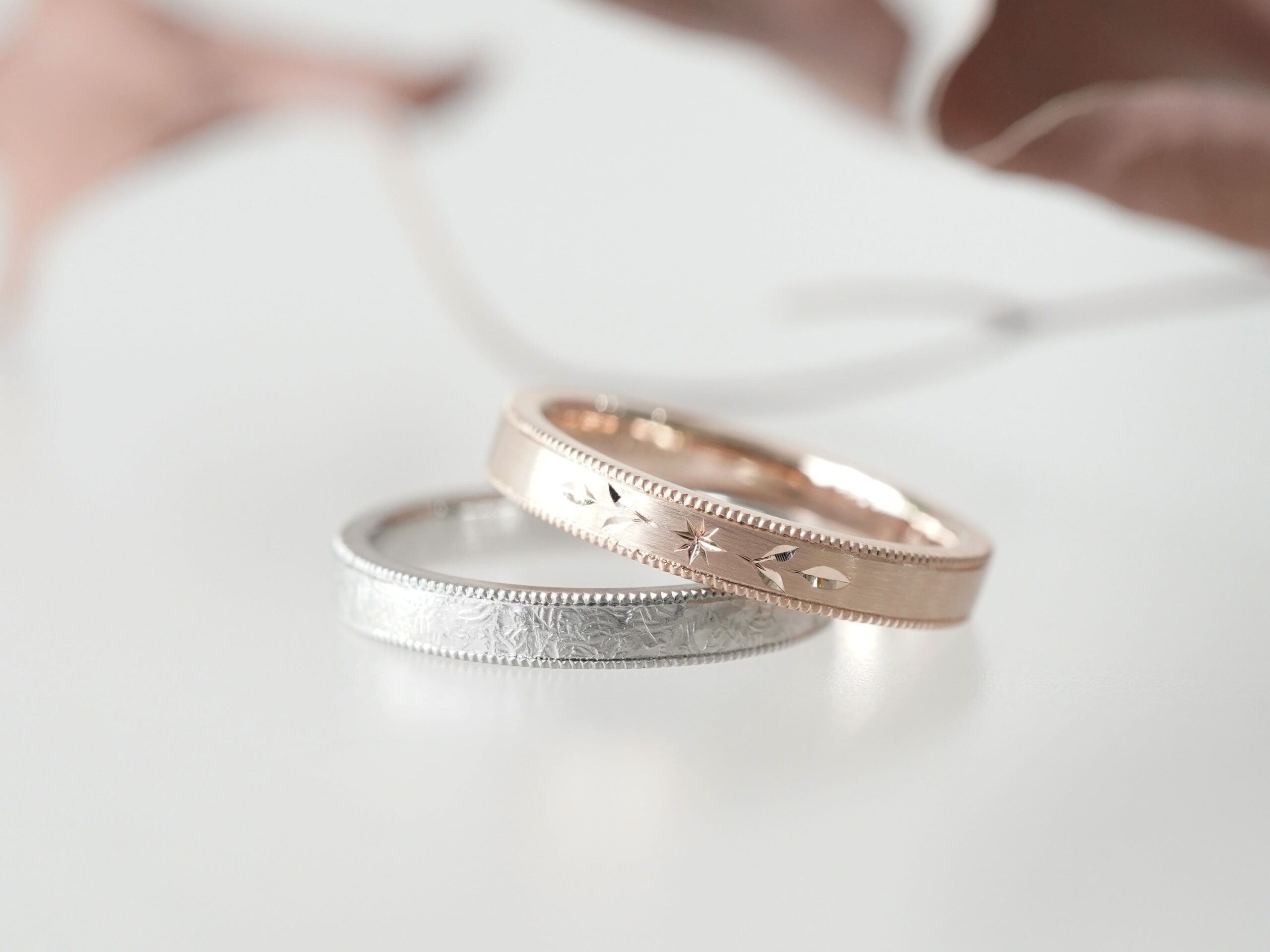 お揃い感と、それぞれの好きな模様を楽しめるご結婚指輪が完成しました。