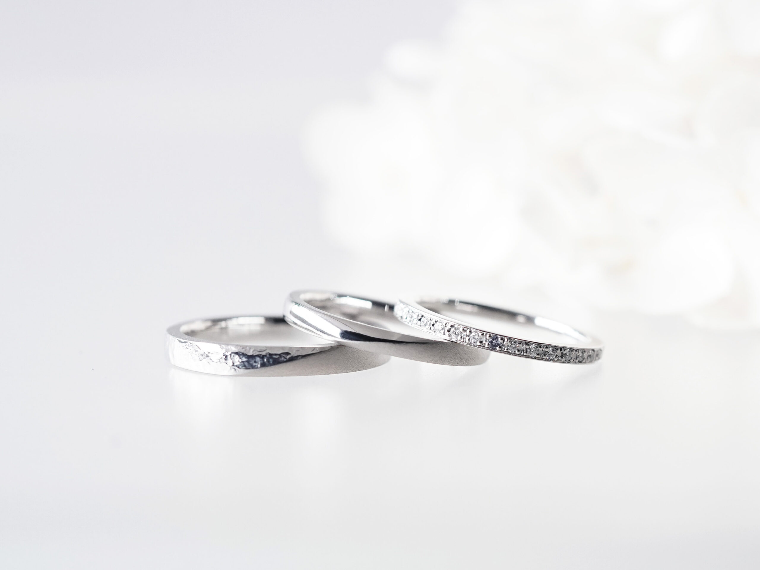 着け重ねたときや、お手元を横に並べたときに統一性もしっかりと感じていただける、純白のセットリングとなりました。