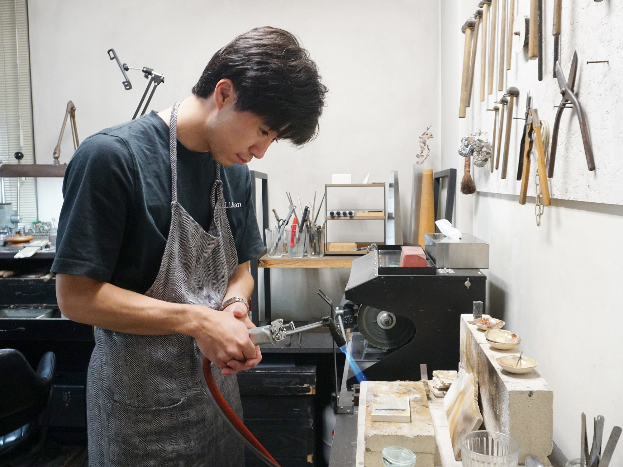 手にしたバーナーという機械の先から、やわらかな炎が指輪の素材を包み込みます。