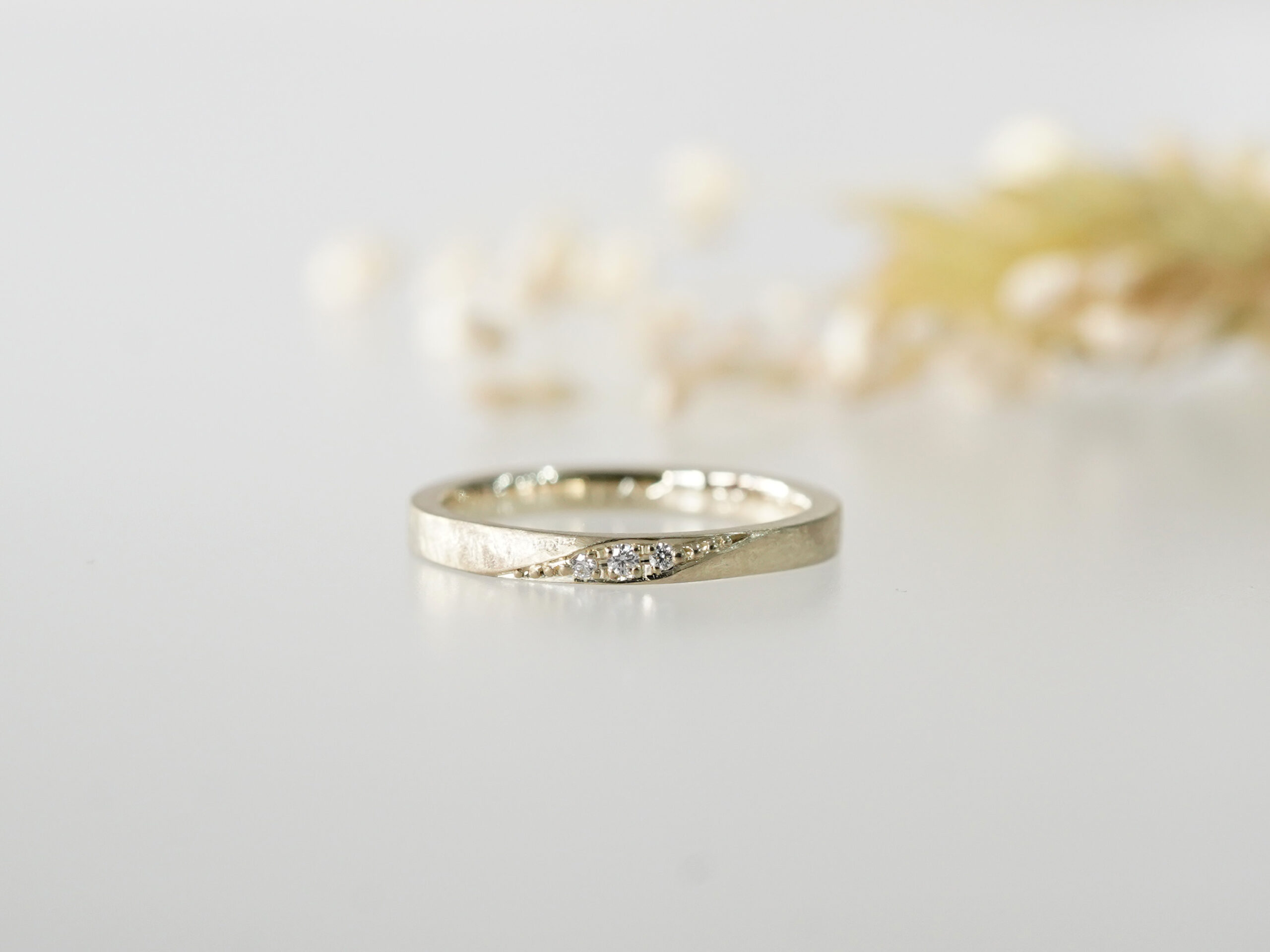 指元には、3石のダイヤモンドが上品に並び、さりげない存在感を放ちます。