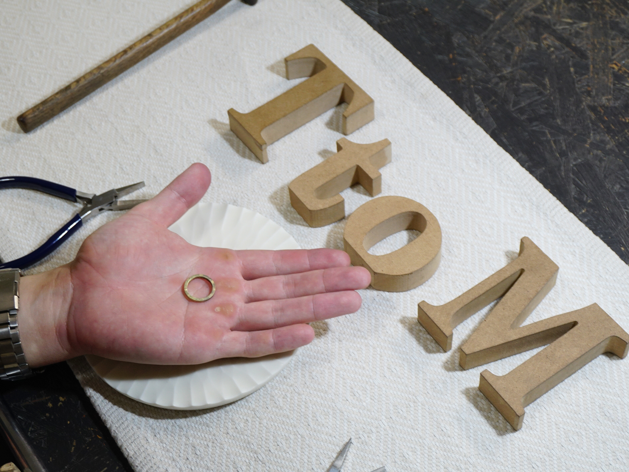 最初の一本の棒から、炎や工具を使って作り上げたこの指輪は、すべて手作り。